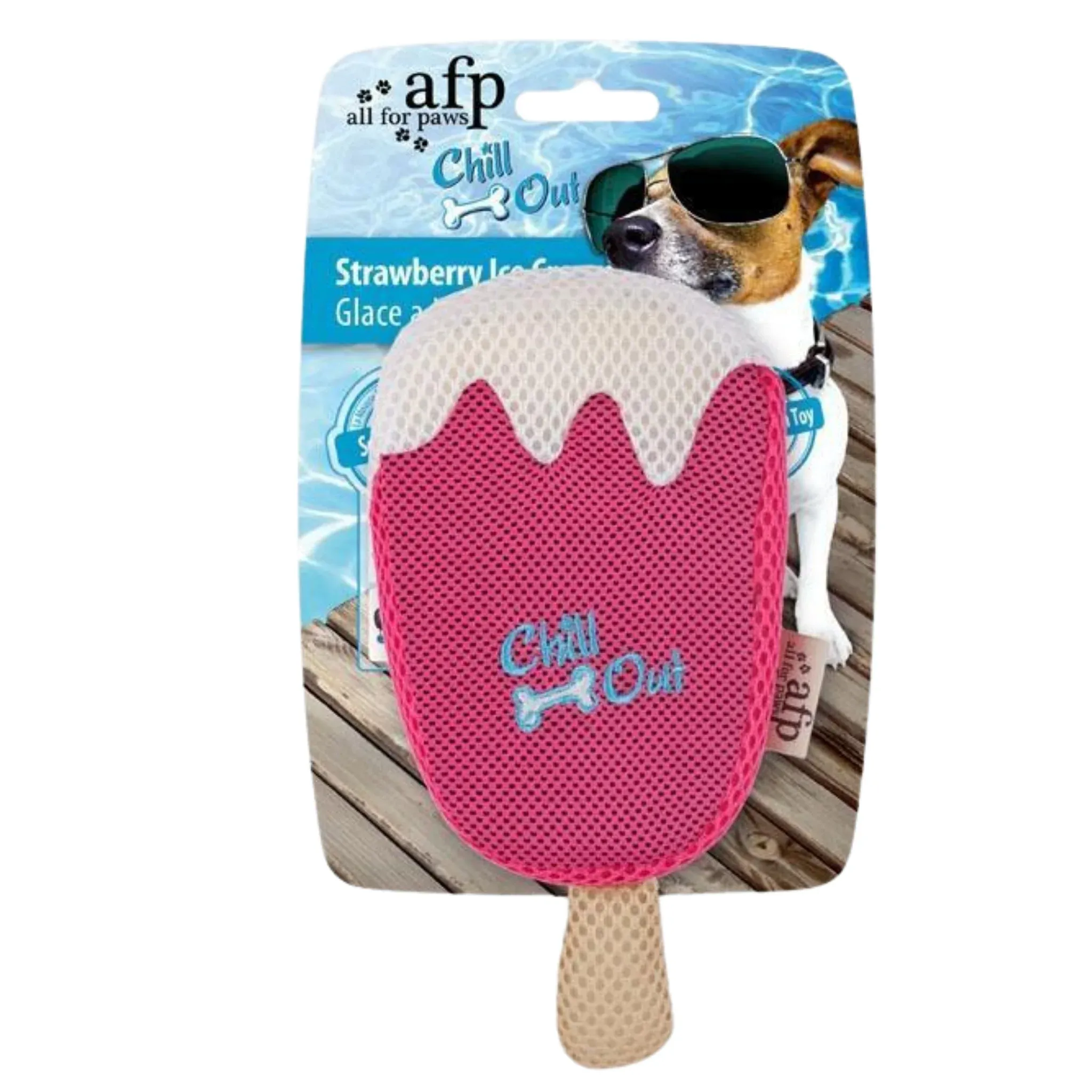 The All For Paws Chill Out Strawberry Ice Cream is a fun, cooling chew toy designed to help keep your dog refreshed during warm weather. Shaped like a strawberry ice cream, this toy can be soaked in water to activate its cooling sponge core—perfect for soothing playtime on summer days.