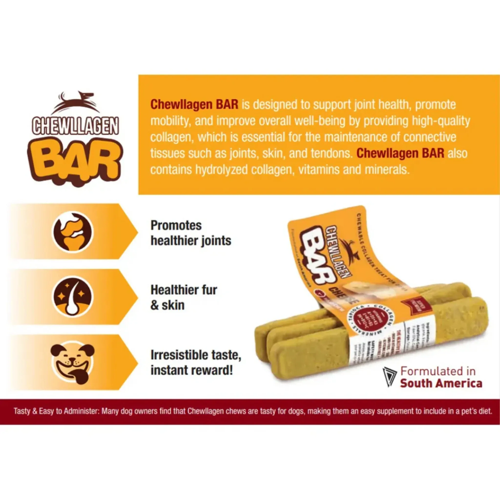 The Chewllagen Cheese Bar is a natural, collagen-rich dog chew designed to support your dog’s joint health, mobility, and overall well-being. Infused with hydrolysed collagen, essential vitamins, and minerals, it promotes flexibility and vitality while offering a delicious long-lasting chew.