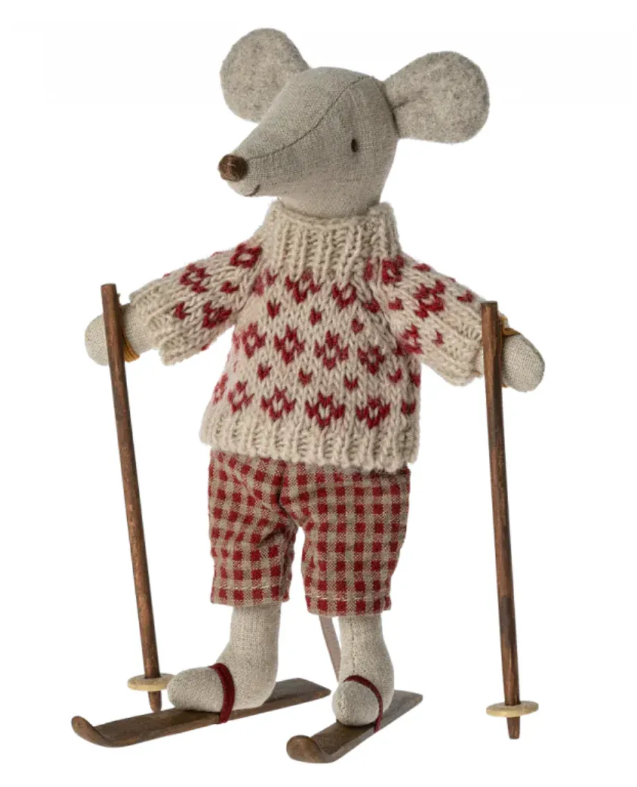 A mouse ready for hours of fun on the slopes during the cold wintertime. Each playset contains a warmly dressed mouse with a pair of ski and poles. A funny detail is the ears which are made so they look like the mouse is wearing ear warmers.